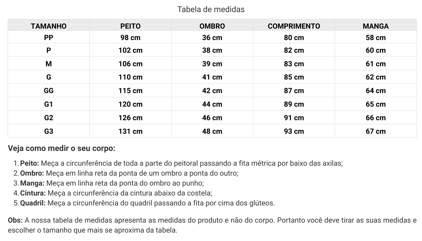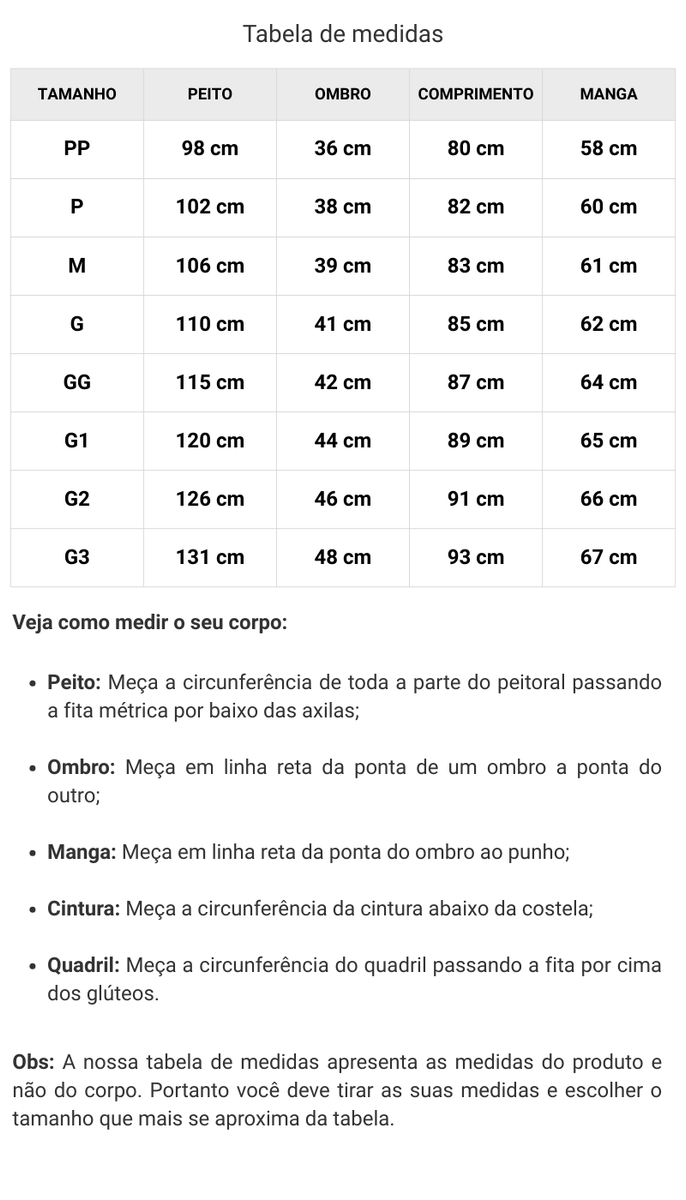 3. A tabela de medidas do produto está