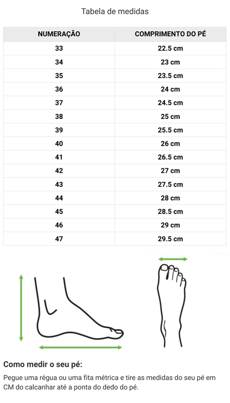 Tabela de Teça seu pé em CM do calcanhar ao dedo do pé: